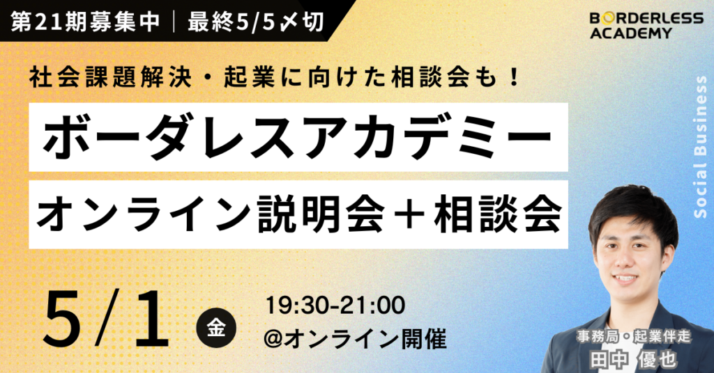 36歳を迎えるタイミングで、ボーダレス・ジャパンが開催する社会起業プログラム「ボーダレス・アカデミー」に参加しました。干支を3周したところが人生の折り返し地点だと感じ、自分のために人生を使うのはもう終わりでいいなと思いました。