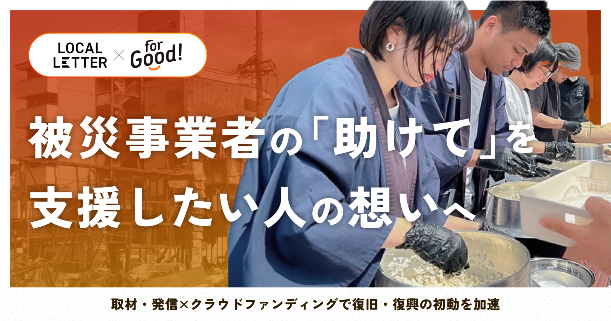 株式会社ボーダレス・ジャパン(代表取締役CEO:田口一成/本社:福岡県福岡市)が運営する、ソーシャルグッドに特化したクラウドファンディングサービス「For Good」(事業代表:小松 航大)は、地域発信型メディア「LOCAL LETTER」(運営:株式会社WHERE)と連携し、全国の災害支援を継続的に実施していくことをお知らせします。